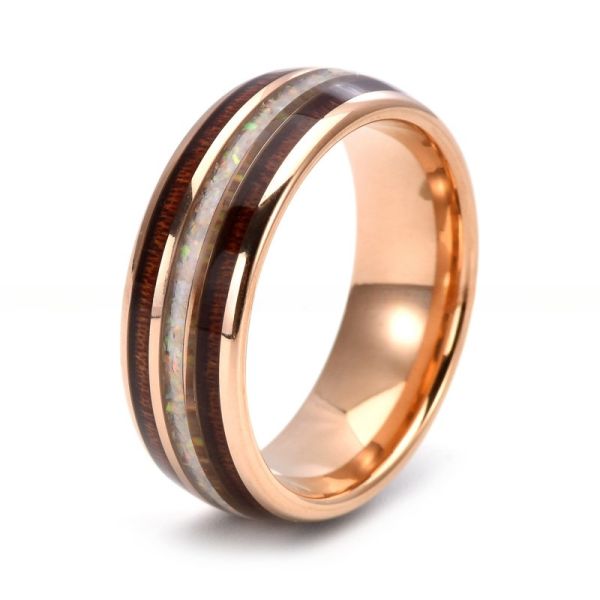 TRENDY 8mm Tungsten Wedding Band with White Fire Opal and Koa Wood Inlay Men's Dome Style Rose Gold Plated Ring Images |